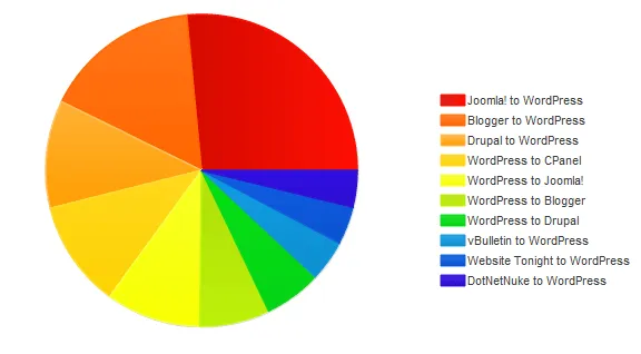 This new information provides an insight into where users are going with their technology, so as well as being able to see from the trends how much a web technology is being used, you'll now be able to get an idea of where they came from. For example, Joomla! users are migrating to WordPress. The pie chart gives a representation of how many are doing this, as you'll also notice some users are migrating to Joomla! from WordPress!