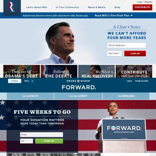 In conclusion, from a user perspective the sites are tied in their functionality offering. From a technical perspective BarackObama.com is a slightly better implementation thanks to its conservative use of JavaScript includes and better meta data support.