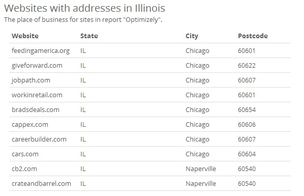 Clicking on states in the business location report will bring back all of the matching websites and their business locations, all exportable to CSV for use in Excel, Salesforce or any other application your business uses!
