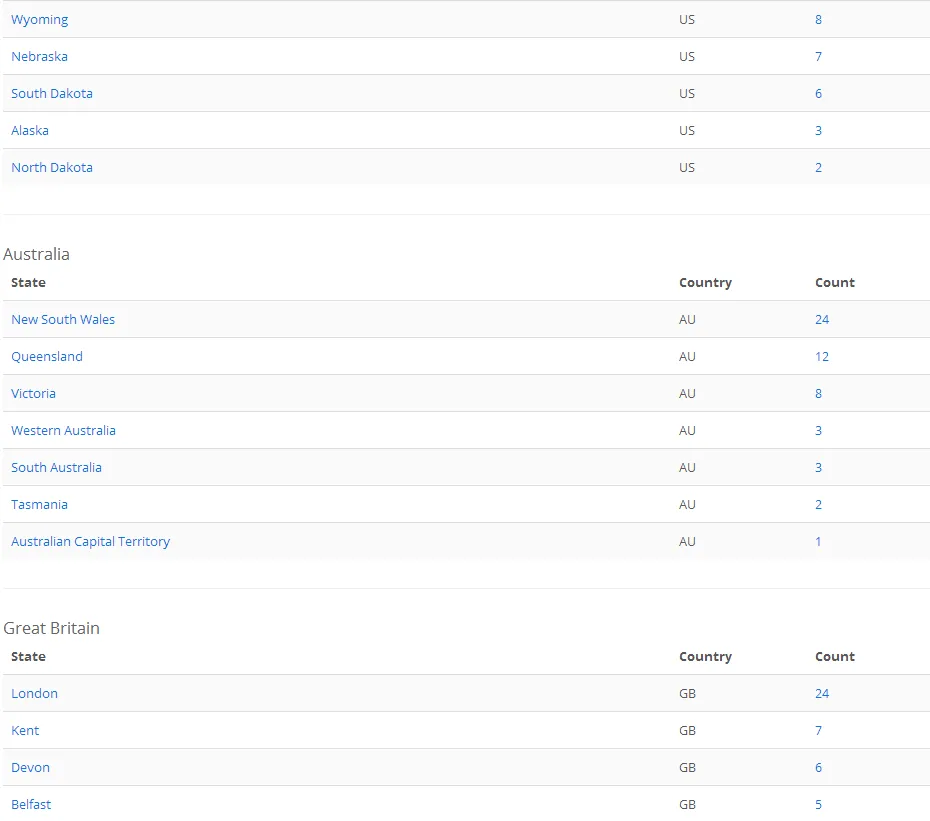 The list you'll see next will show how many websites from your report have a physical address in each of the regions shown. As you can see in the image below, these results are grouped in regions or states rather than whole countries. By clicking on a region you're interested in, you'll see more detail of the websites with an address in the area. This can be especially helpful if you want to run very tight geographically focused campaigns.