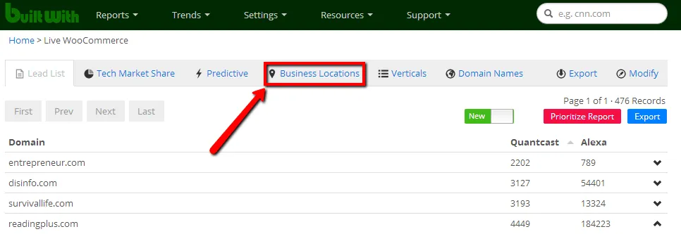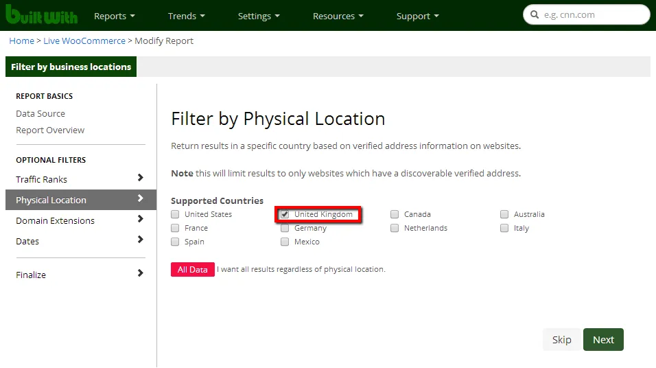 In BuiltWith, reports give you a structured list of all the indexed websites which match your chosen criteria. There are a range of filters available to help identify only the results you're interested in. To generate a list of potential international customers, you'll want to use the "Physical Location" filter.