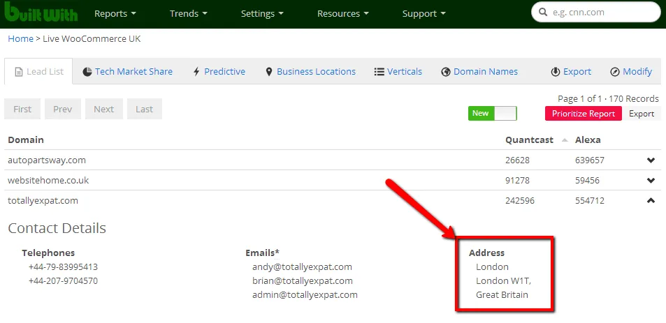 The image below shows the report for websites using WooCommerce, as before, but now only sites with a UK address are listed.