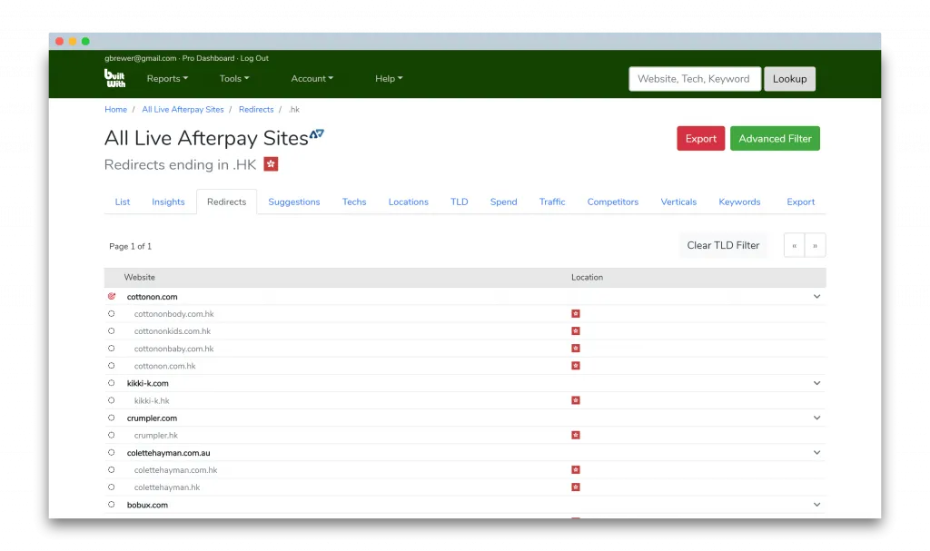 This data is also fully exportable on the 'Export' tab of the report as TSV that lists all of the sites in your reports and all of the sites that those sites redirect from. The benefit of this data is it helps to find geo-localized versions of sites.