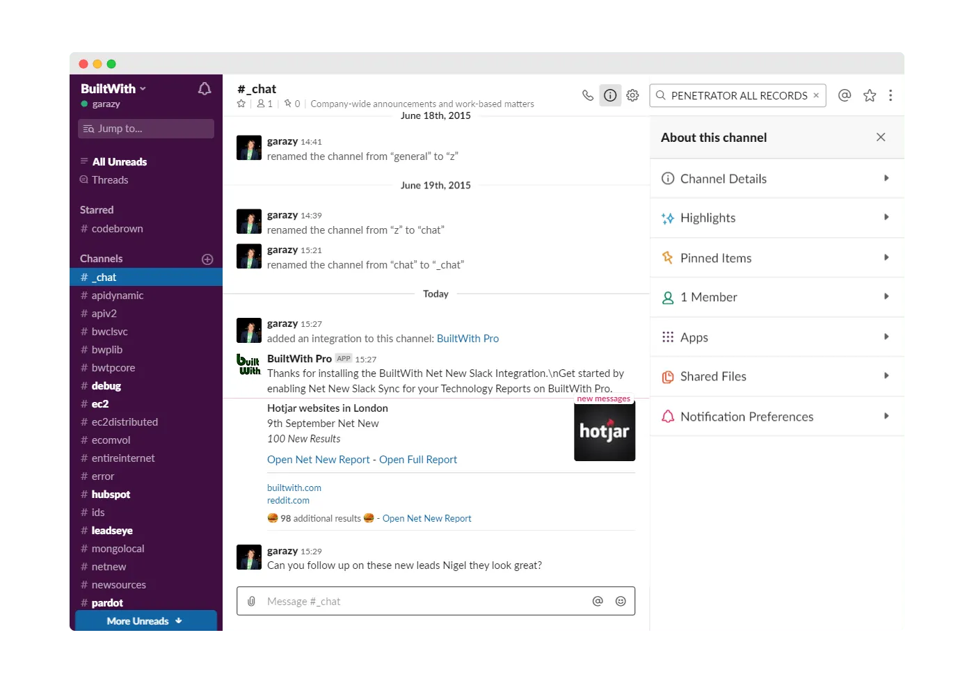 Watch the demo and get started here - https://kb.builtwith.com/data-integrations/slack-integration/