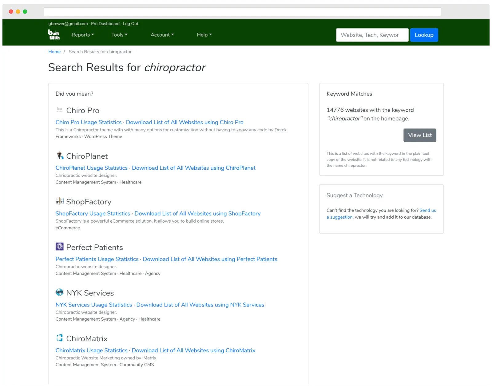 There's at least 5 technologies that are related to Chiropractor (searching for Chiropractic found others) - Perfect Patients, NYK Services, ChiroMatrix and ChiroPlanet. These could be our starting point as they are super related technologies.