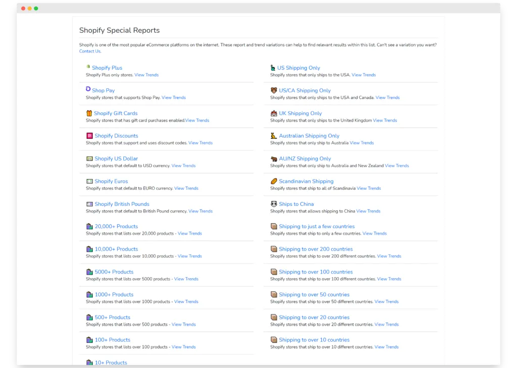 This top level filtering can help make these super large lists into something a little bit more useful. Checkout the options at https://trends.builtwith.com/websitelist/WooCommerce-Checkout/Entire-Internet and https://trends.builtwith.com/websitelist/Shopify/Entire-Internet under the 'Special Reports' section of the page.